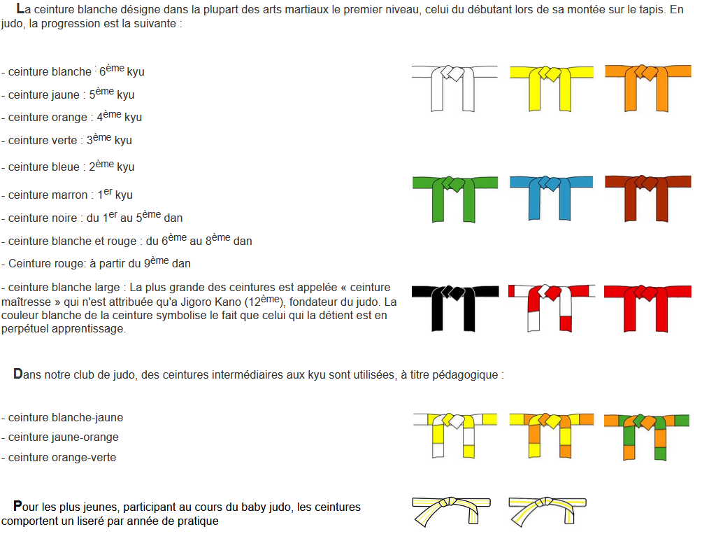 Pour les couleurs actuelles, elles sont inventées en Angleterre par Gunji Koizumi en 1926, introduit en France par Mikinosuke Kawaïshi en en 1935, les ceintures de couleurs furent précédées de 10 niveaux de grade créés en 1886 par Jigoro Kano sur les base du menkyo.